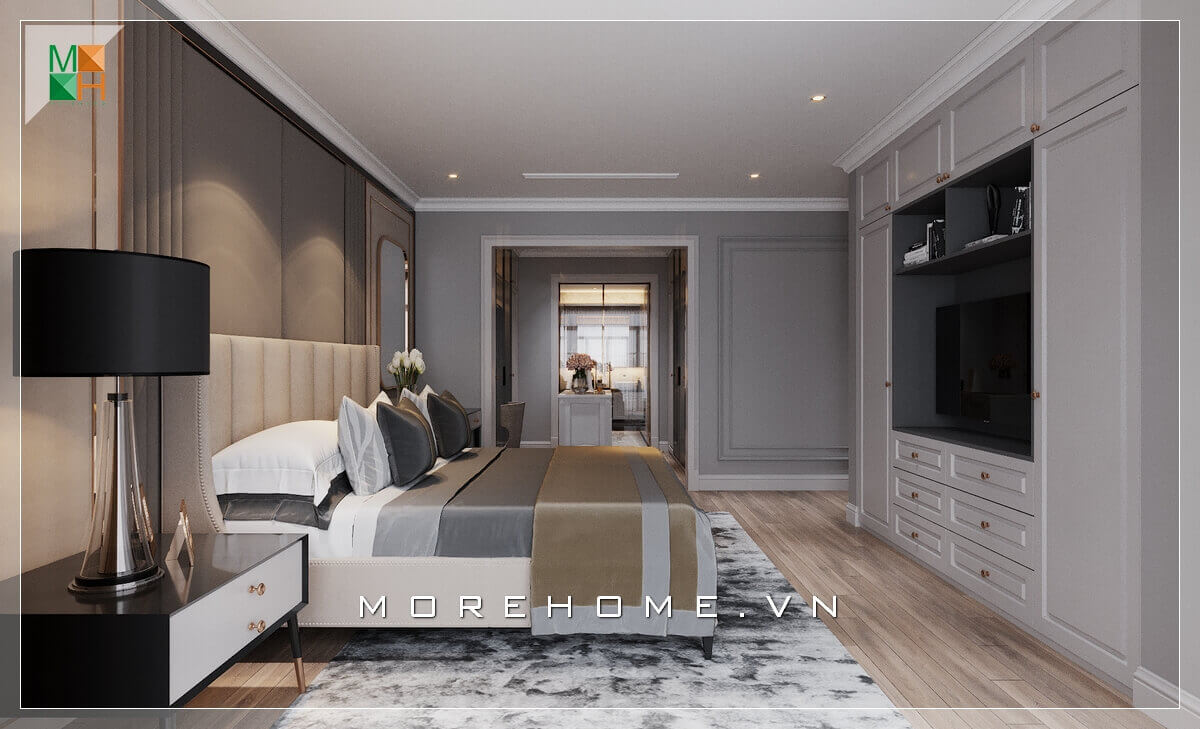 Tone màu chủ đạo của căn phòng ngủ là trắng và xám thích hợp cho phòng ngủ mang phong cách tân cổ điển sang trọng.