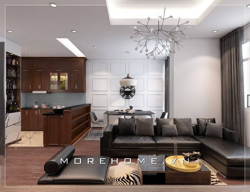 Mẫu thiết kế nội thất phòng khách chung cư hiện đại với đồ nội thất sang trọng: sofa da cao cấp, đèn trang trí, gỗ ốp sàn,...mang đến không gian sống đẳng cấp cho gia chủ