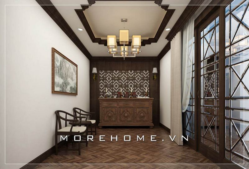 Phòng ngủ phong cách indochine được thi công bởi Morehome đem đến không gian nghỉ ngơi, thư giãn thoải mái, tiện nghi sau những giờ làm việc dài