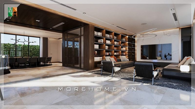 Tủ sách liền ngay phòng khách được thiết kế hiện đại từ chất liệu gỗ óc chó cao cấp sử dụng như một vách ngăn tiện lợi, sáng tạo của biệt thự, nhà phố