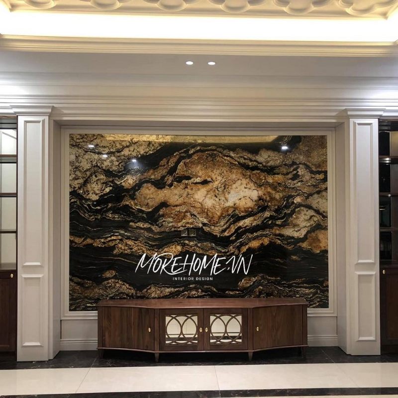 Mẫu đá ốp vách tivi phòng khách với hoa văn đá vô cùng ấn tượng cho không gian phòng khách thêm sang trọng