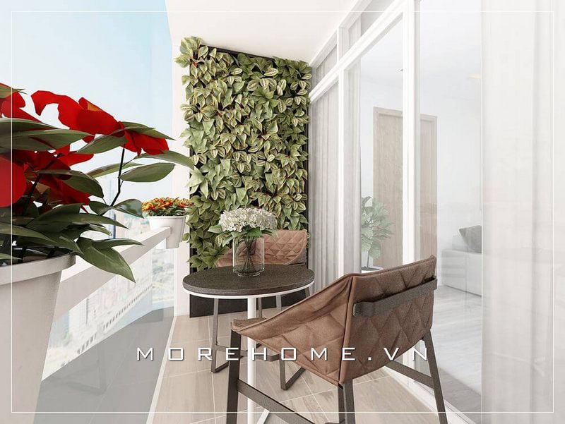 Ghế ngồi ban công và các chậu hoa được trang trí theo một cách độc đáo, tạo nên một không gian xanh mát lý tưởng để thư giãn.
