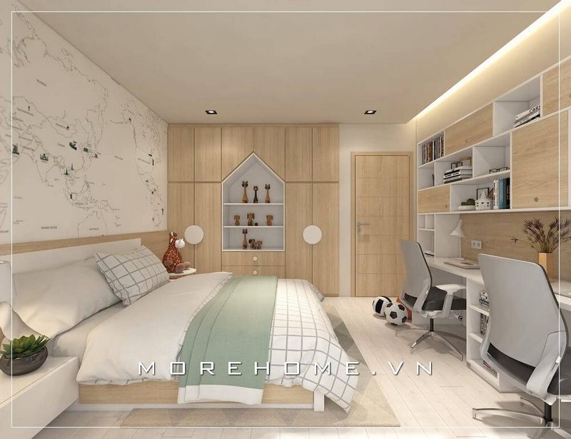 Mẫu giường tầng gỗ màu trắng với thiết kế hiện đại và ấn tượng sẽ giúp con bạn có một không gian nghỉ ngơi và học tập thoải mái nhất, đồng thời tiết kiệm không gian tối đa.