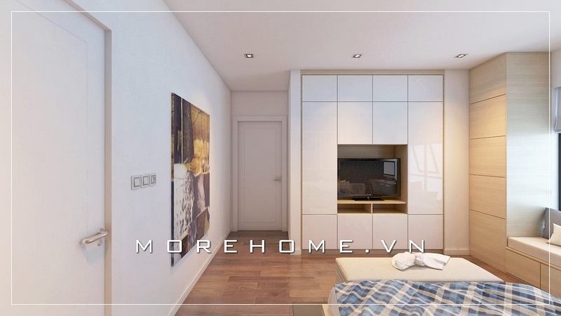 Tủ quần áo được thiết kế hiện đại, kết hợp với kệ ti vi đầy đủ tiện nghi và tinh tế.